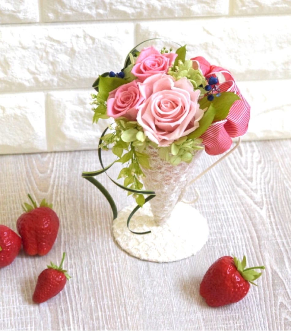 プリザーブドフラワーをふんだんに使って、可愛らしいパフェに仕上げました。