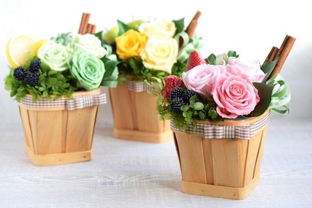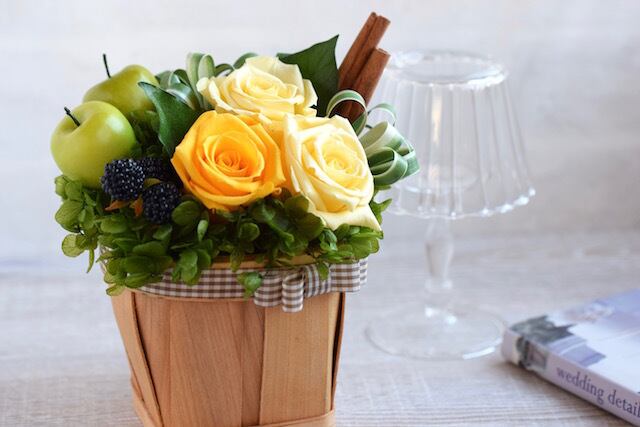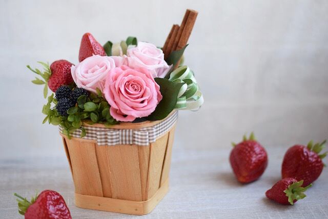 プリザーブドフラワーのローズやアジサイ、フェイクのフルーツを使ったアレンジメントです。