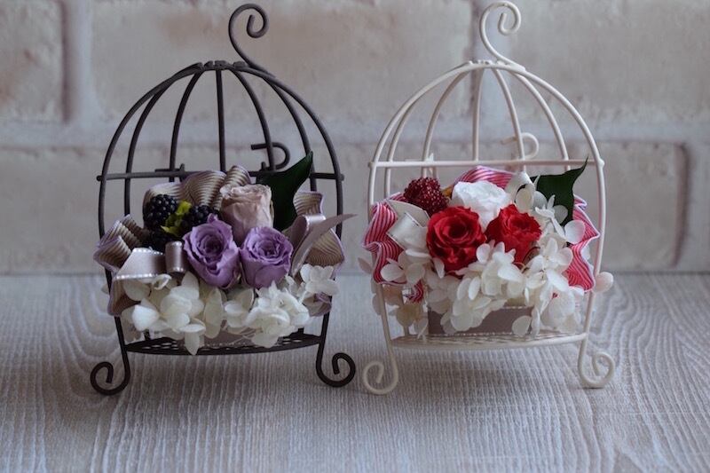 鳥かごをリボンや小さなローズ、ベリーで飾りました。